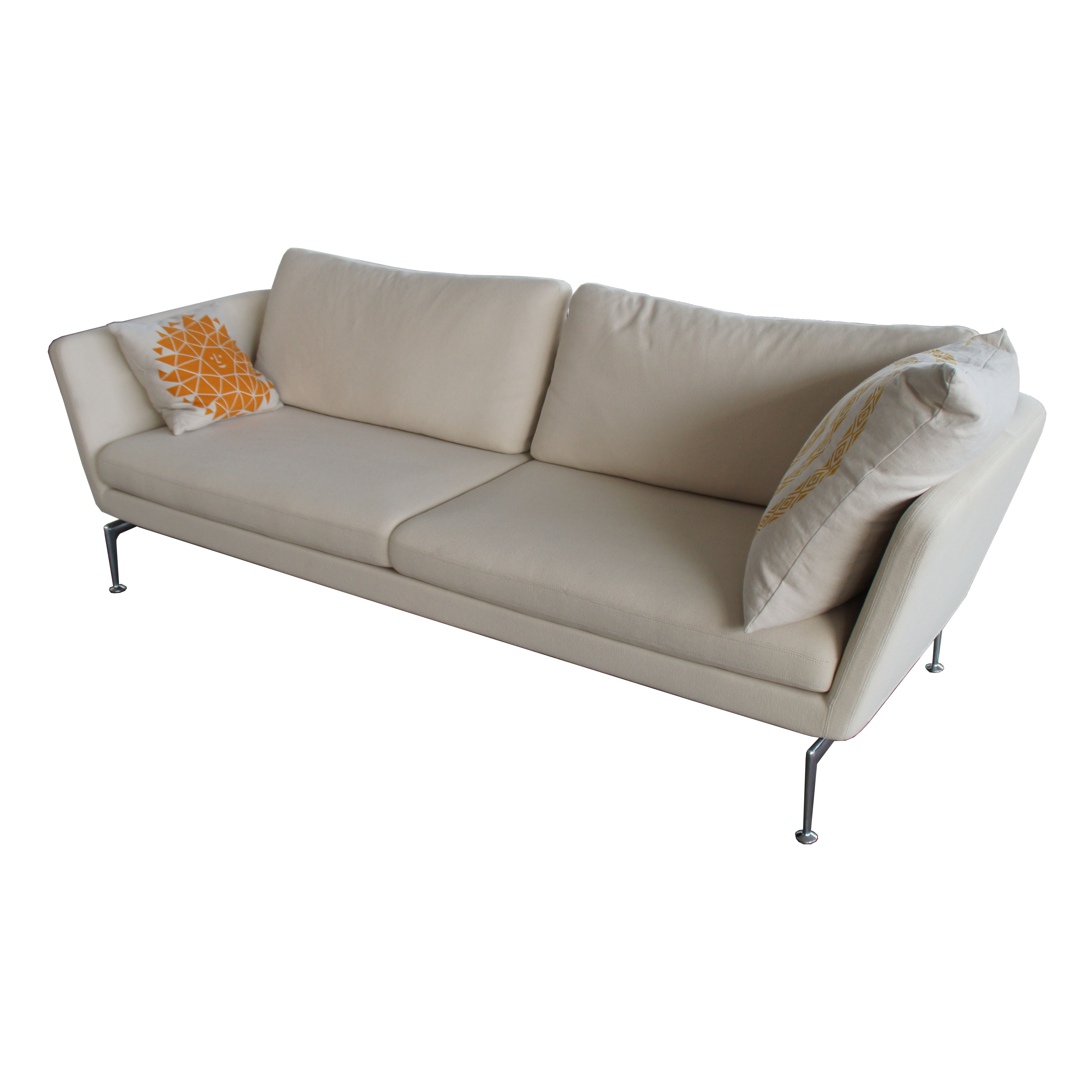 Suita Sofa – designed by Antonio Citterio for Vitra. With its light and technical appearance the Suita 3 Seater Sofa gives off an elegant air and is also surprisingly comfortable – the first-class upholstery provides highest comfort, even without extra cushions! Vitra is suited for events lounges, trade shows, waiting areas , owing to its clear, geometric shape. The body is made of a belted steel structure, coated with shaped foam. The bridge-like feet made of polished aluminium carry the construct reliably |