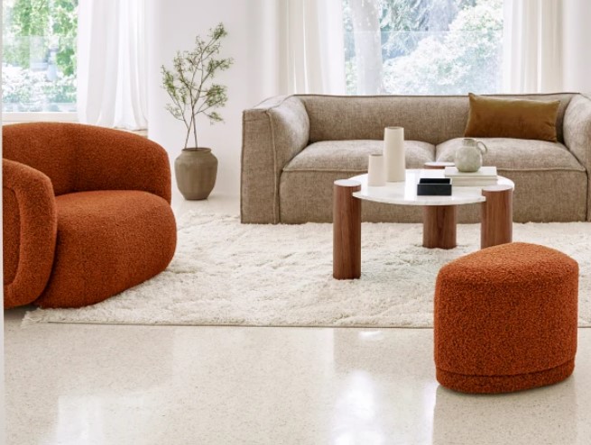 This rust-colored boucle fabric armchair fits naturally into all interior styles. With its soft upholstery and rounded shapes, covered with a super cozy and textured ecru bouclé fabric – density 630g/m2. it promises irresistible moments of relaxation gives you the freedom to customize your atmosphere for your event.
